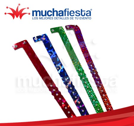 Brazalete de plástico holográfico, Colores: rojo, azul, morado, verde neón,naranja neón, plata, oro, Venta mínima 100 piezas, Precio por pieza. Pregunta por el costo de impresión