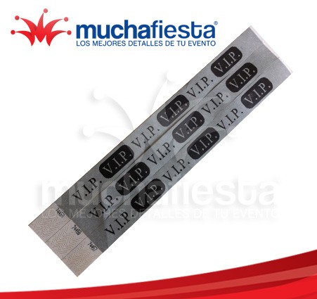 Brazalete fabricado con fibras plásticas con impresión VIP, Colores: rojo, fuego neón, rosado neón, negro, azul, amarillo, plata, aqua, azul claro, naranja neón, amarillo neón, lima neón, morado, verde, blanco y oro, Venta mínima 100 piezas, Precio por pieza.