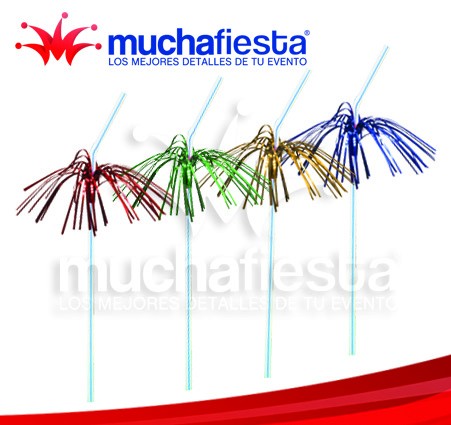 Popote decorado con tiras metálicas. Tamaño estandar. Se vende en colores surtidos